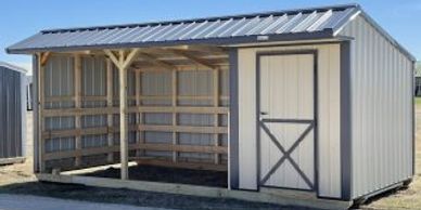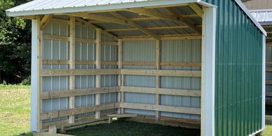 The Run In Shed is a great solution for giving your horses, mules, donkeys, goats, or other hoofed animals some relief from the sun, rain, wind or hail. Our run-in sheds are metal-covered. The interior walls have kickboards, to protect the metal siding from kicks that could cause dents. The floors are open to the natural earth but are braced to maintain strength for a lifetime.